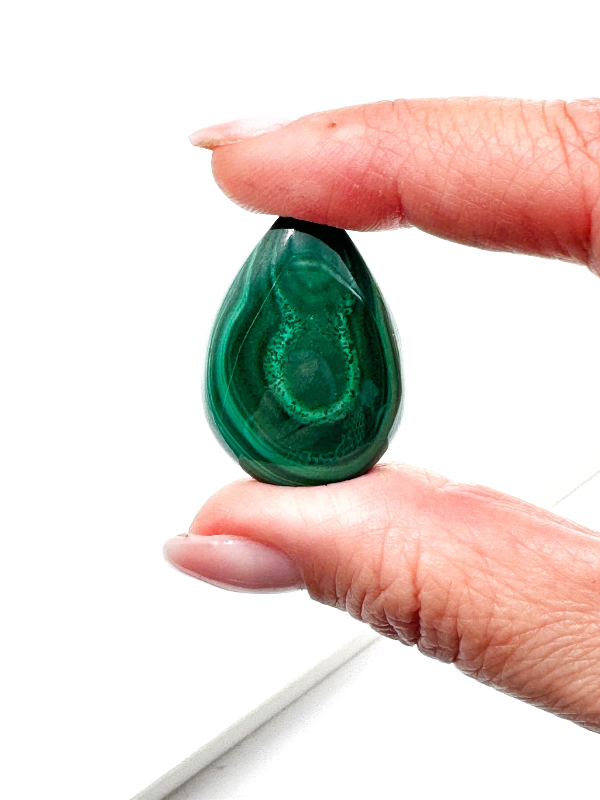 Malakit hjælper på transportsyge og flyskræk. Den er også god mod svimmelhed, hvis du mediterer med stenen på panden.
