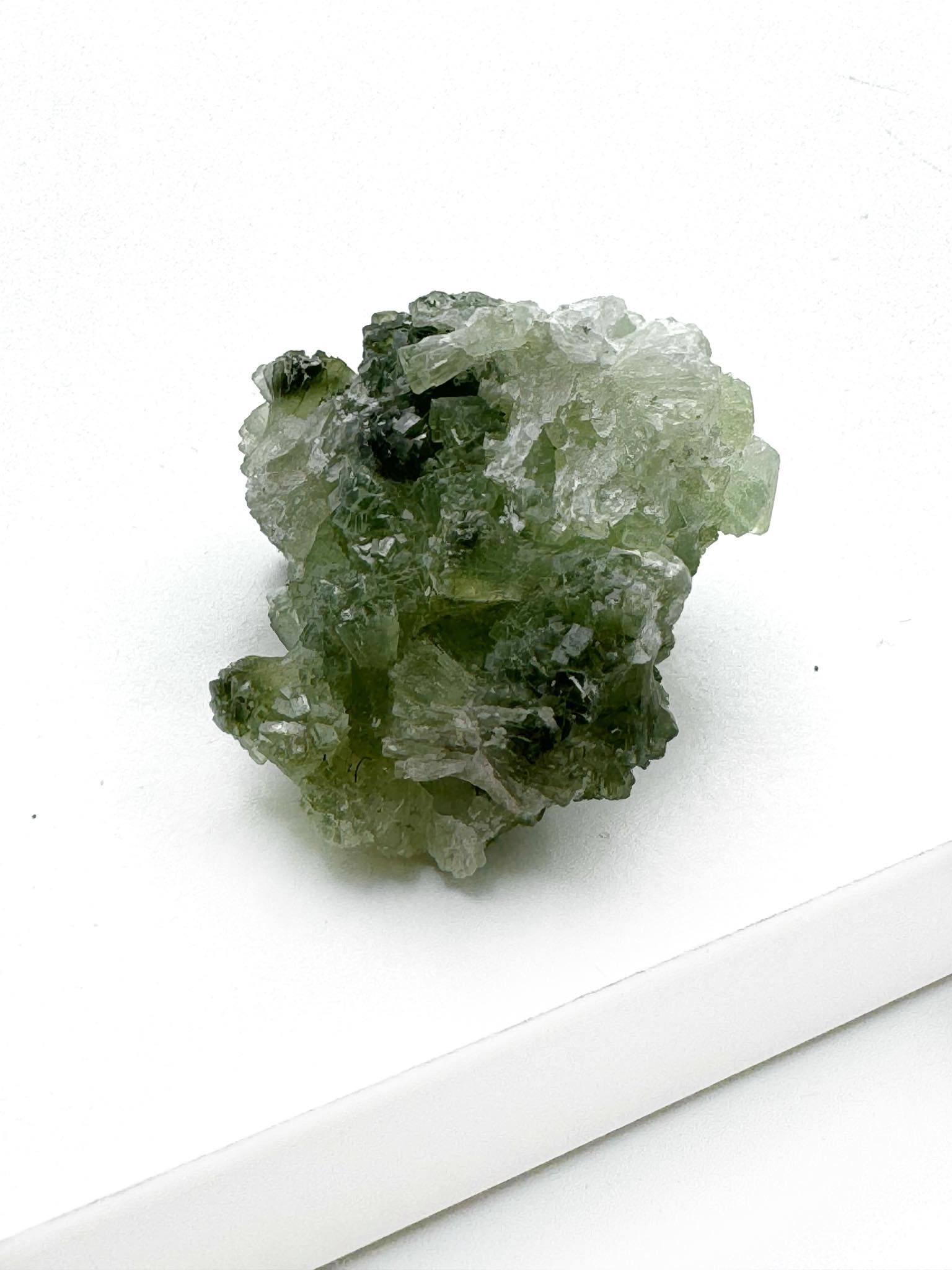 Grøn Prehnit tåler vand og kan med fordel energirenses med saltvand, havvand eller rindende vand.