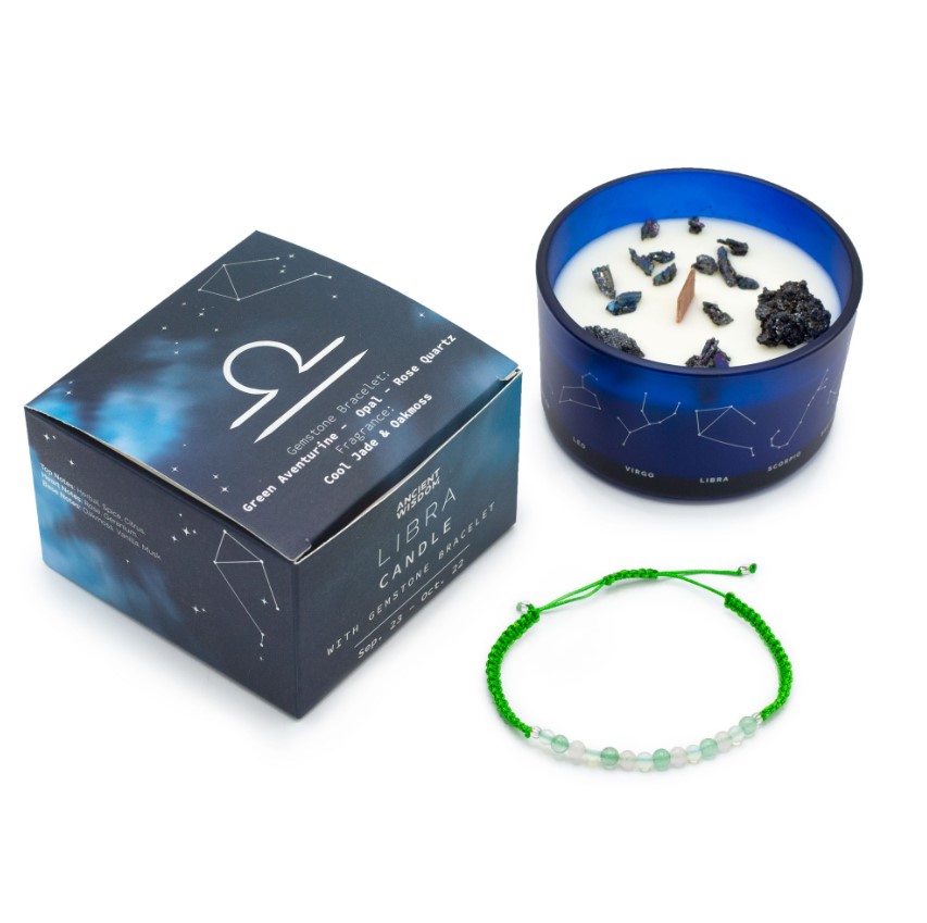 Sættet inkluderer et smykkearmbånd med Grøn Aventurin, Opal og Rosenkvarts, nøje udvalgt til at resonere med Vægtens diplomatiske ånd, forstærke deres charme og fremme balance i deres relationer: